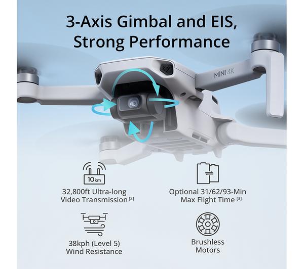 Robust Flying – Mini 4 K flies steady and reliably and keeps your footage stable even when flying in environments with level-5 winds, up to 38kph.