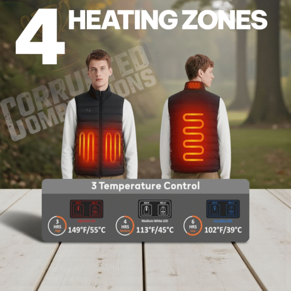 The vest features 4 core heating zones—both sides of the abdomen, the back, and the neck—to keep your body warm, improve circulation, and help ease winter aches. It offers 3 heat settings and separate front and back controls, so you can choose exactly how warm you want to be.