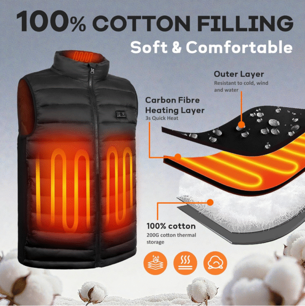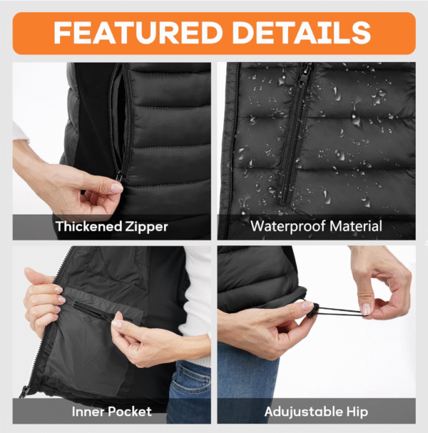 It also comes with a 10,000mAh power bank that heats the vest in seconds and can last up to 8 hours. The material is lightweight, windproof, waterproof, and even machine-washable once the battery is removed.