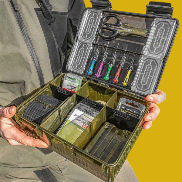 Korum Fishing Tackle Storage Blox Fully Loaded, BLOX is a new tackle storage concept aimed squarely at the angling allrounder. Designed to house all you need in one highly organised place. We’ve carefully sized BLOX to house must-have items of end tackle, like spools of line, packets of hooks and accessories. There’s the option to use the dedicated BITS BLOX if you prefer compartments, as well as being able to house terminal tackle in the lid of the box. Your Baiting Tools and Scissors all click into place neatly, whilst the main box can be adjusted with dividers to suit your needs. If desired, you can also put your RIG BLOX inside, keeping all your pre-tied hook lengths safe from the elements. It’s one box that does it all!